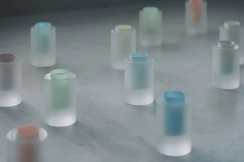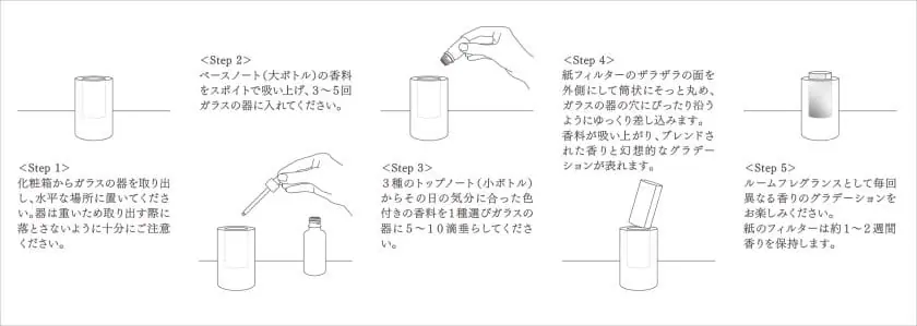 ユーザーのネガティブな感情を癒す香りと、その感情をハグする(受け入れる)コンセプトの香りがついた2色の液体を、ユーザー自身のカスタマイズで調香・調色し、それをフィルターが吸い上げて混ざり合うことで、使用する度に新たなマーブル状のグラデーションと香りを楽しめる仕様になっています。