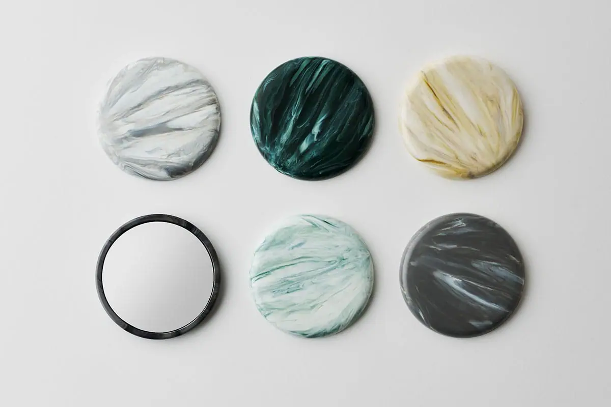 プラスチックの廃棄物をマーブル模様が美しい、リサイクルプラスチック純度100%のマテリアルによみがえらせるサービス「ParallelPlastics(パラレルプラスティックス)」。現在は天然石のような模様のコームやミラー、マグネット、リングなどの製品展開をおこなっています。