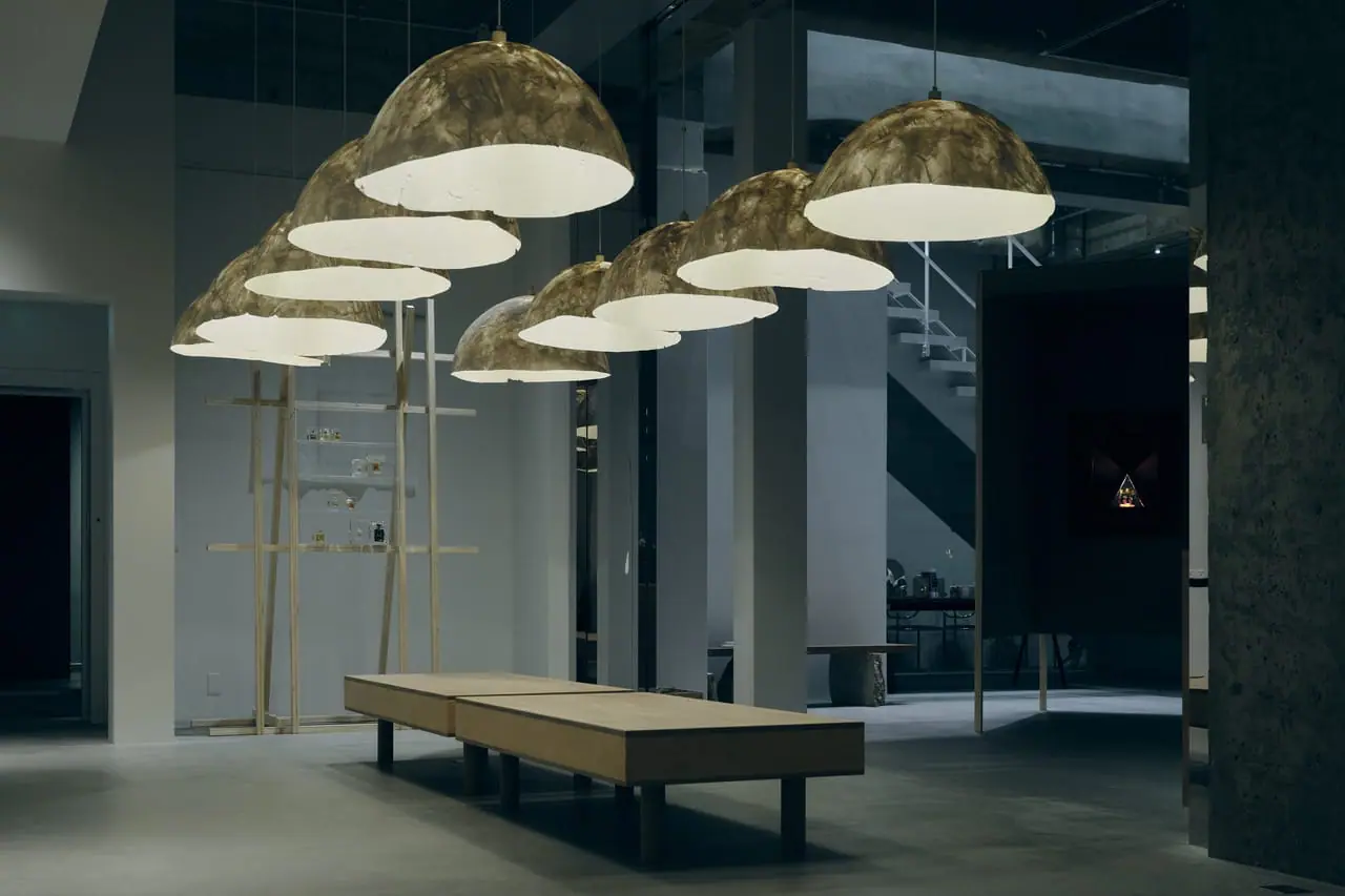 これまでテラゾーなどで素材を「閉じ込める」手法をしてきた外山に、新たな一面をもたらした印象を与えたのが、ガラス繊維を固めてつくったランプシェードだ。照明の明るさによって、内側と外側で異なる表情を見せ、柔らかな光をつくりだす。複数並べることで空間を演出していたことも印象深かった。
