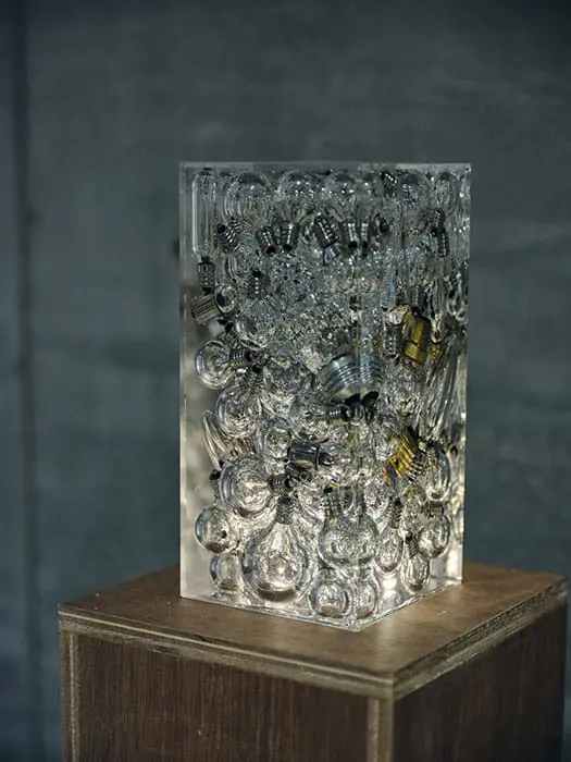 一般的に車はプラスチック、ガラス、鉄、金などさまざまな素材からつくられるが、再生工場に持ち込まれるのは1,000台生産したうちの1台の確率だという。そんな現状を伝える展示で、地下には昨年展示した廃ガラスを中心としたインスタレーション、1階には車1台をつくるのに必要な地球資源の量などをビジュアルや実際の廃材、オブジェやアート作品で表現していた。