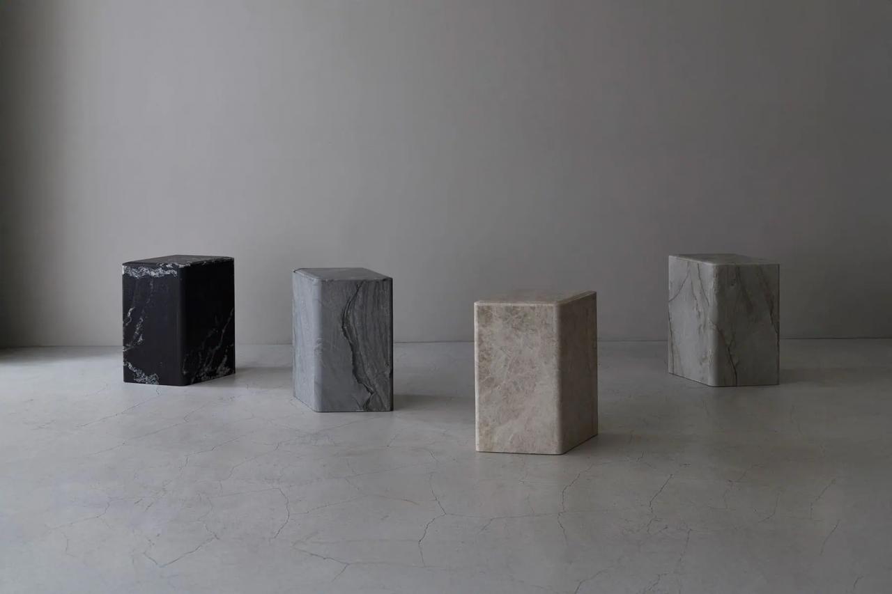 さらに同会場に置かれた「OKUMI」は、天然石の板を重ねて構成したスツール。着物の前身頃が合う部分についている半幅の布「衽(おくみ)」が名前の由来で、着物がもつ左右非対称の美意識から発想を得ている。異なる模様の素材を組み合わせたものもあり、シンプルなひし形の造形が美しい作品だ。