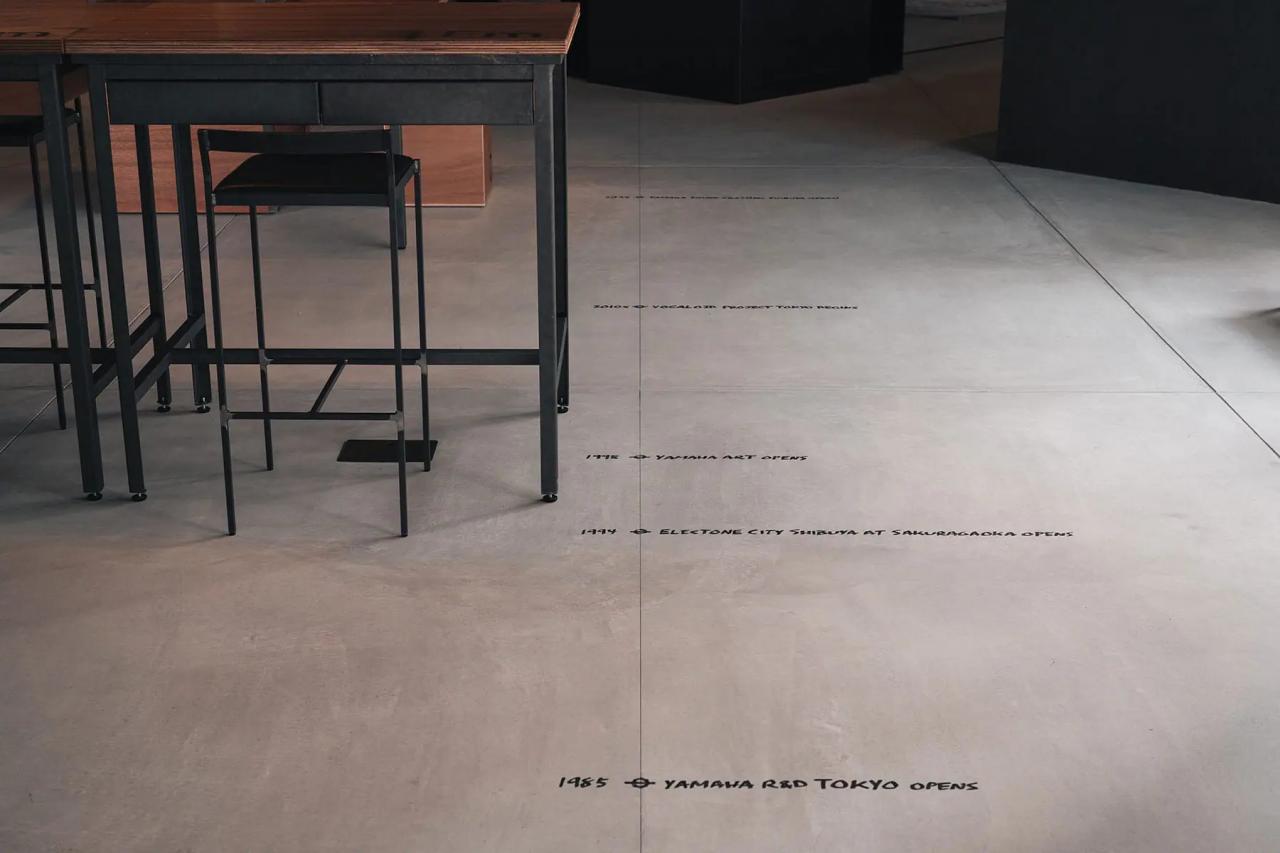 また、床にある墨出し(建設現場で設計図面の情報に基づき、柱や基準線などを床や壁に書き込む作業のこと)のグラフィックは、ヤマハ創業からの歴史や全国にあるヤマハの拠点名を記しています。墨出し工程の際は、ヤマハの方々にも立ち会ってもらったので職人さんがとても緊張していました(笑)。