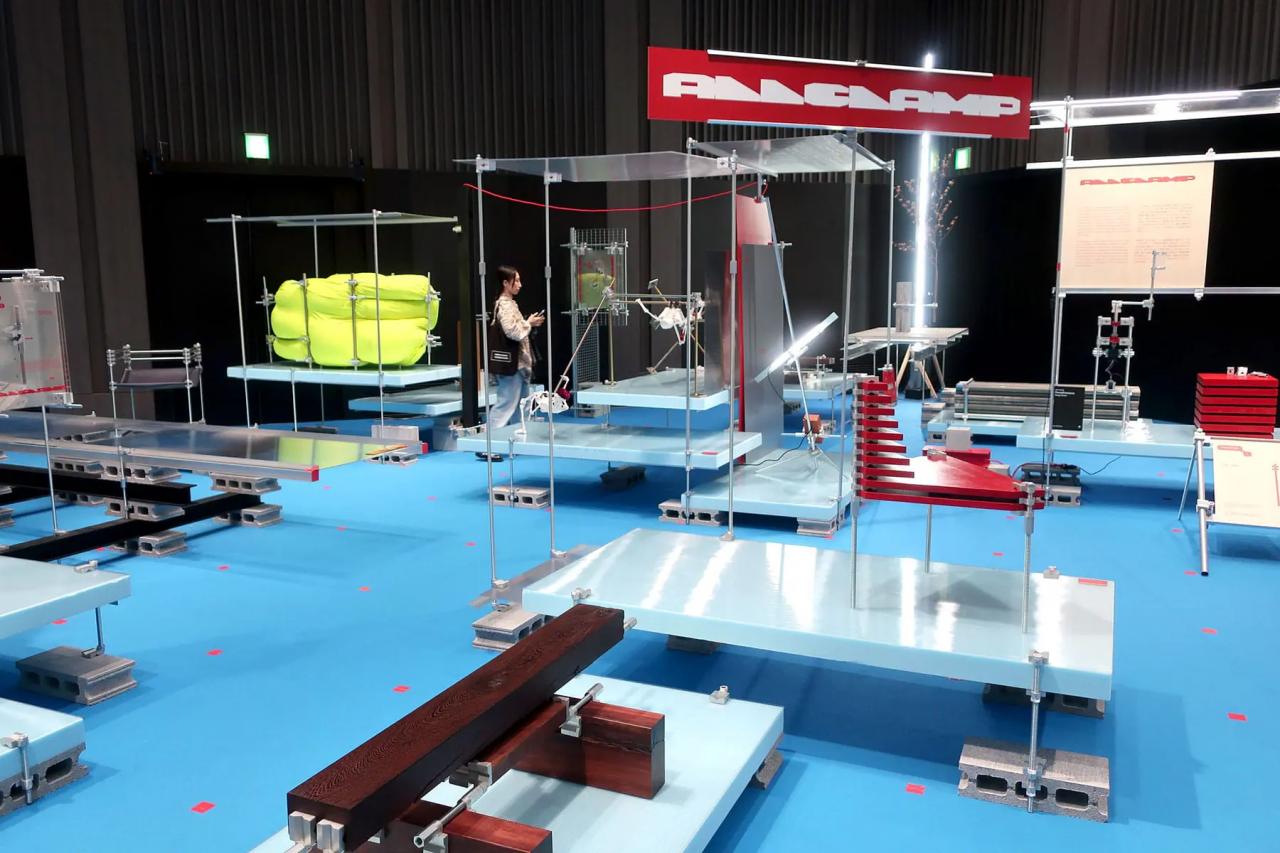 空間デザイナーや写真家、彫刻家などによる「ALL CLAMP」は、会場のいちばん手前、目立つ場所に展示され注目を集めていた。一見すると既製品を使っているようにも見えるが、「ALL CLAMP」と呼ばれる接合部を独自に制作している。素材に穴を空けたり接着をして傷つけることなく、「挟む」という最少限の加工で、椅子やパーティション、ソファなどをつくりあげた。