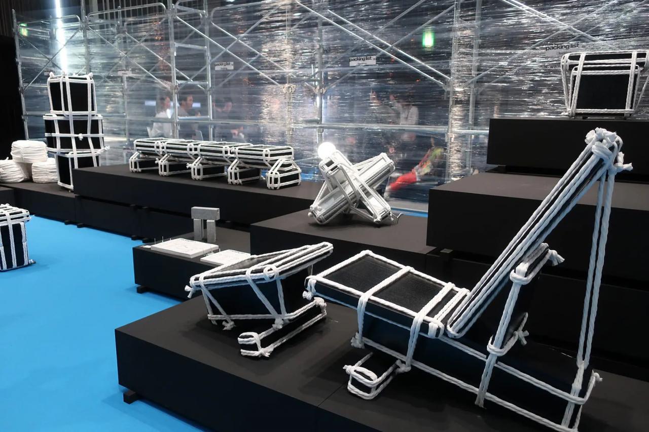 会場の手前の広い場所には、不織布の縄で巻かれた椅子や照明のかたちをしたオブジェが並んだ。これらを手がけたのは、デザインコレクティブのMULTISTANDARD。