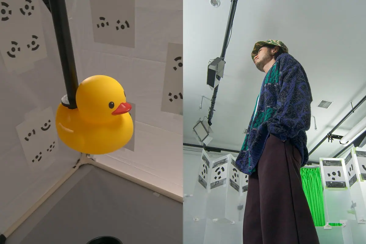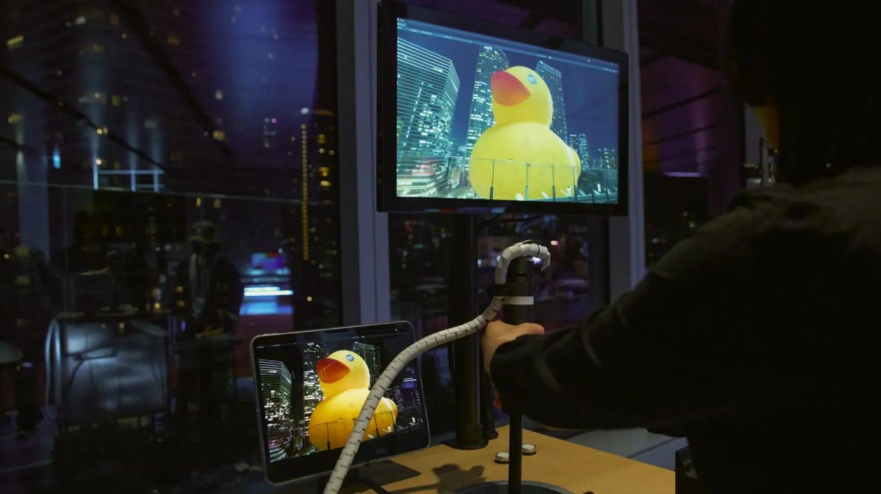 『Gate 01』アヒルのおもちゃなどのプロップを付け替えて体験できる棒型デバイスを箱の中に入れると、プロップが表示された仮想空間がモニターに投影され、高精細ゆえ窓の向こうの世界に反映されたような体験が味わえる