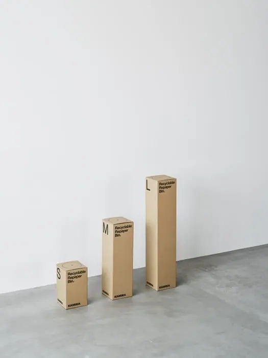 そこで、ほとんど空気を運んでいるような従来のゴミ箱の輸送方法ではなく、平面状のシートをぐるぐると巻いた長細い状態で届き、手元に届いたあと、使う人自身の手で組み立てる仕様になっています。「KAMIKA BIN」は、ゴミから生まれ、暮らしに自在に寄り添い、そして循環し続けるプロダクトです。
